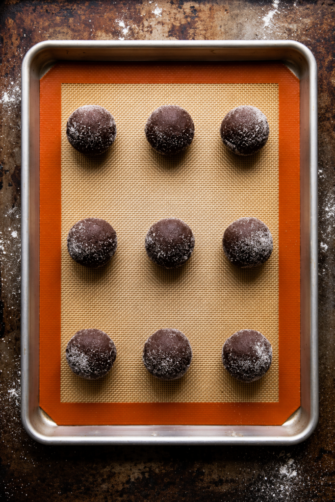 Roll each portion into a ball, then coat it lightly in granulated sugar. Place the dough balls on a lined baking sheet, leaving space between each one.