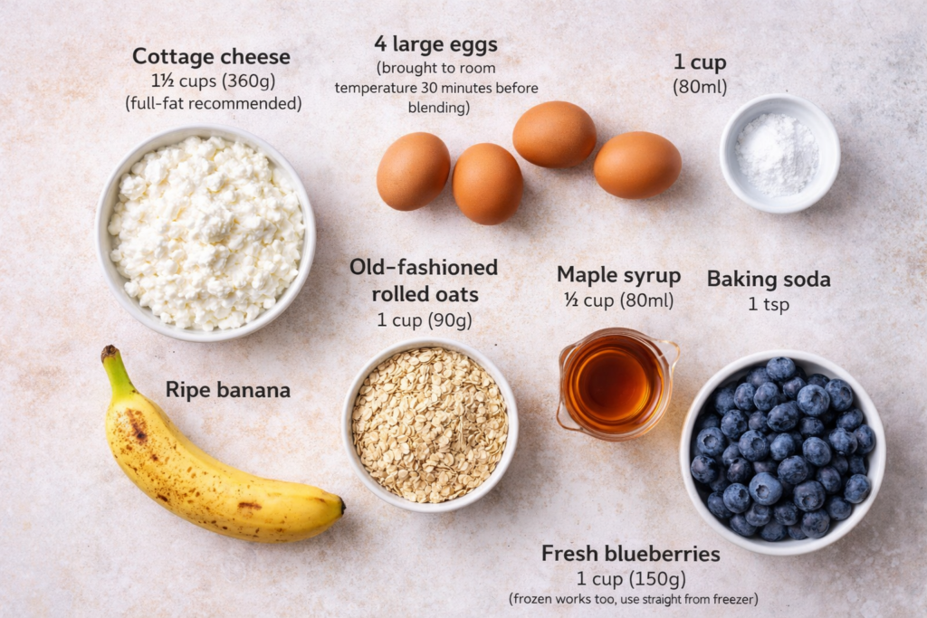The correct approach is restraint. Use just enough honey or maple syrup to balance the tang of the cottage cheese. Let the blueberries provide most of the sweetness. If you want it sweeter, add toppings after baking — that way, you control sweetness without compromising texture.