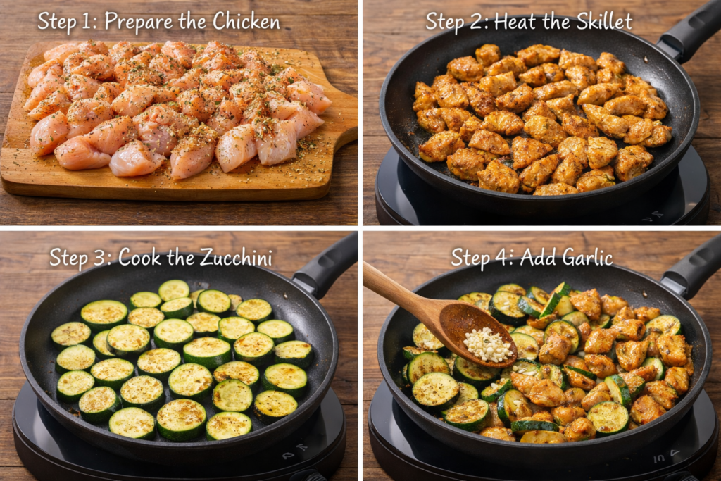 The correct method is high heat searing followed by careful temperature monitoring. Remove the chicken the moment it reaches 165°F. Let it rest briefly before mixing back into the zucchini. This preserves juices and keeps the meat tender.