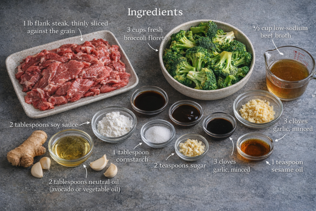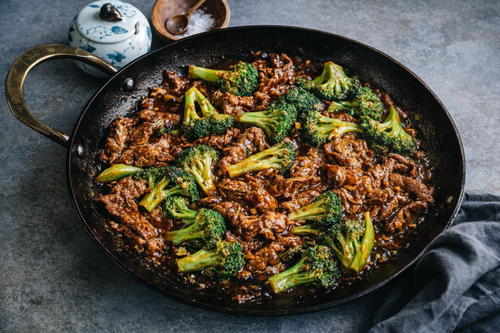 A calm, better-than-takeout beef and broccoli stir-fry with tender slices of flank steak and vibrant broccoli in a glossy savory sauce.