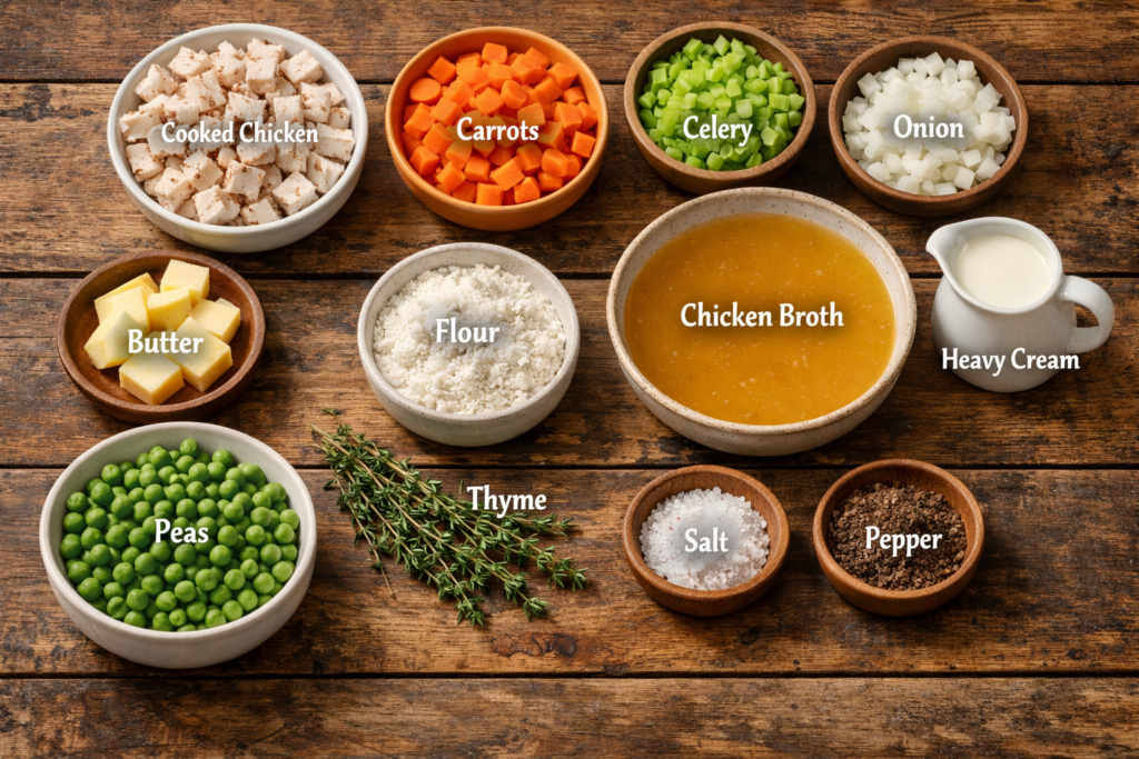 Here’s everything you need to make this creamy chicken pot pie soup.