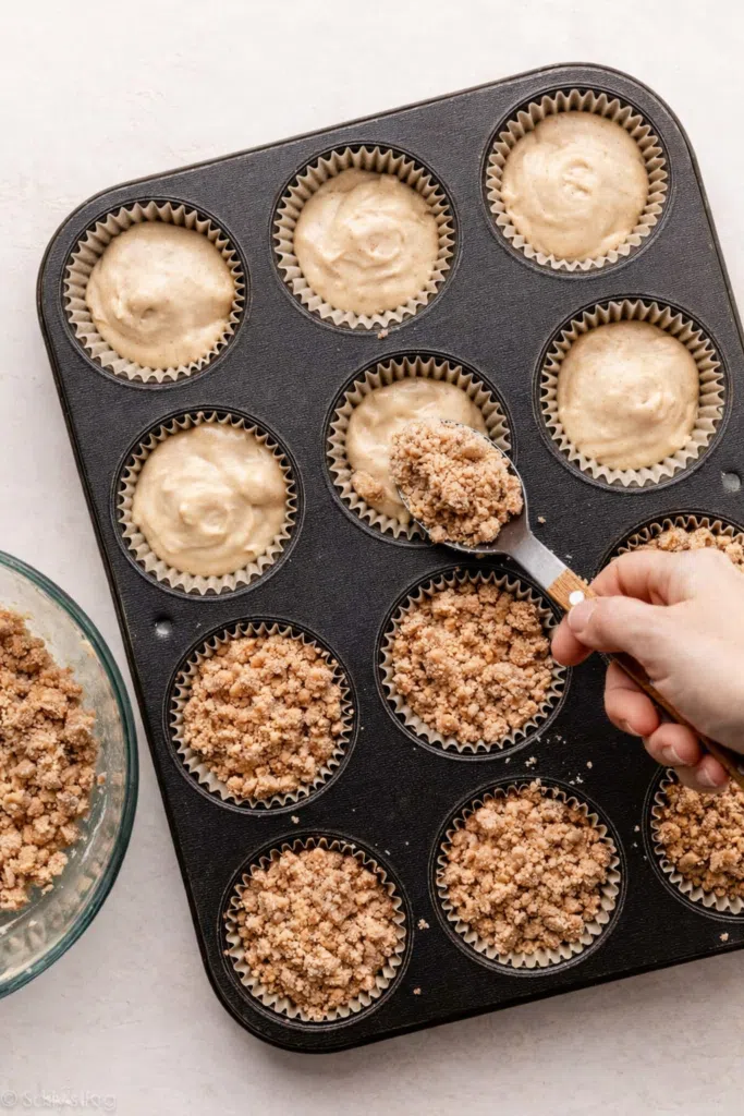 Scoop batter into lined muffin tins, filling each about ¾ full. Pile the crumb topping generously on top — don’t be shy.