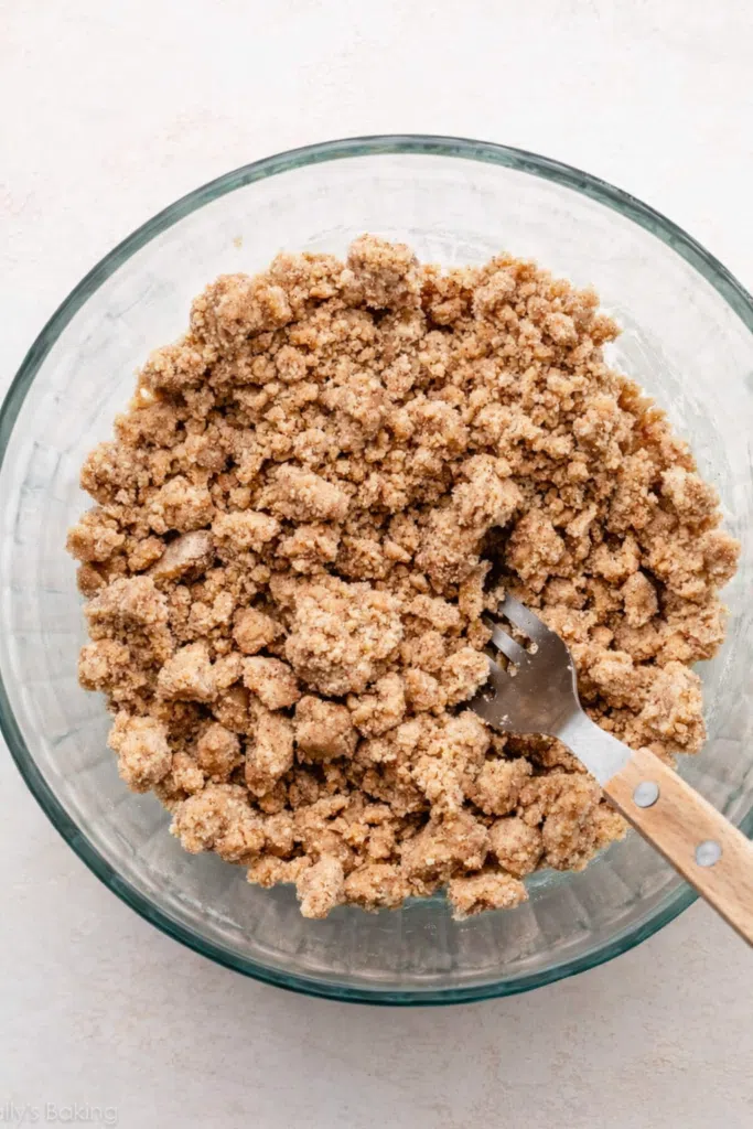 In a bowl, mix the flour, sugars, cinnamon, and salt. Pour in the melted butter and gently stir with a fork until large crumbs form. Set aside. This resting time helps the crumbs firm up slightly, which keeps them from melting into the muffins later.