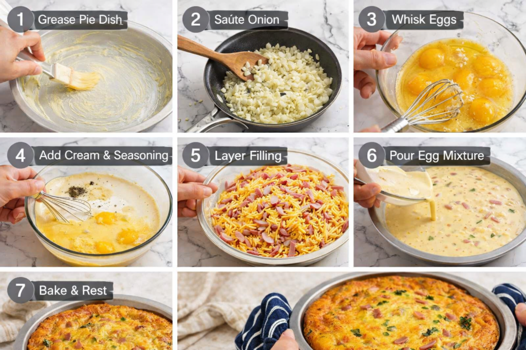 Scatter ham, sautéed onions, and cheese evenly in the prepared dish. This prevents everything from sinking to the bottom. - Pour the egg mixture slowly.