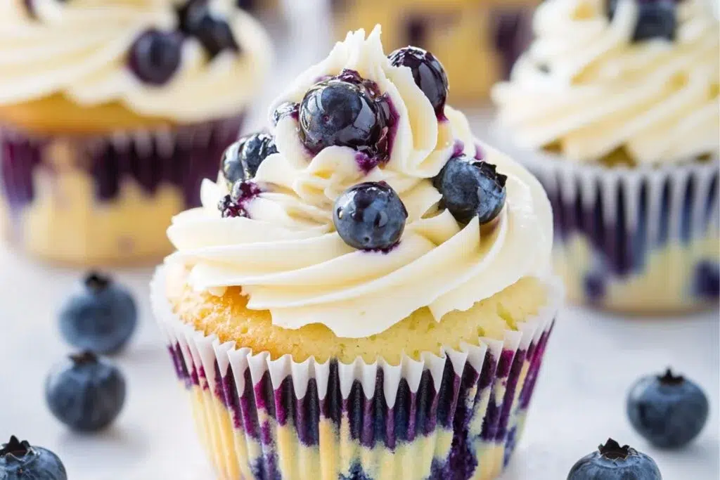 Before folding the blueberries into your batter, toss them lightly in a little flour. That simple trick keeps them suspended throughout the cupcake instead of sinking to the bottom—just like we do to keep berries evenly distributed in our Raspberry Lemon Loaf Cake. Most importantly, don’t overmix the batter once you add the flour. Overworking it develops the gluten and leads to denser, tougher cupcakes.