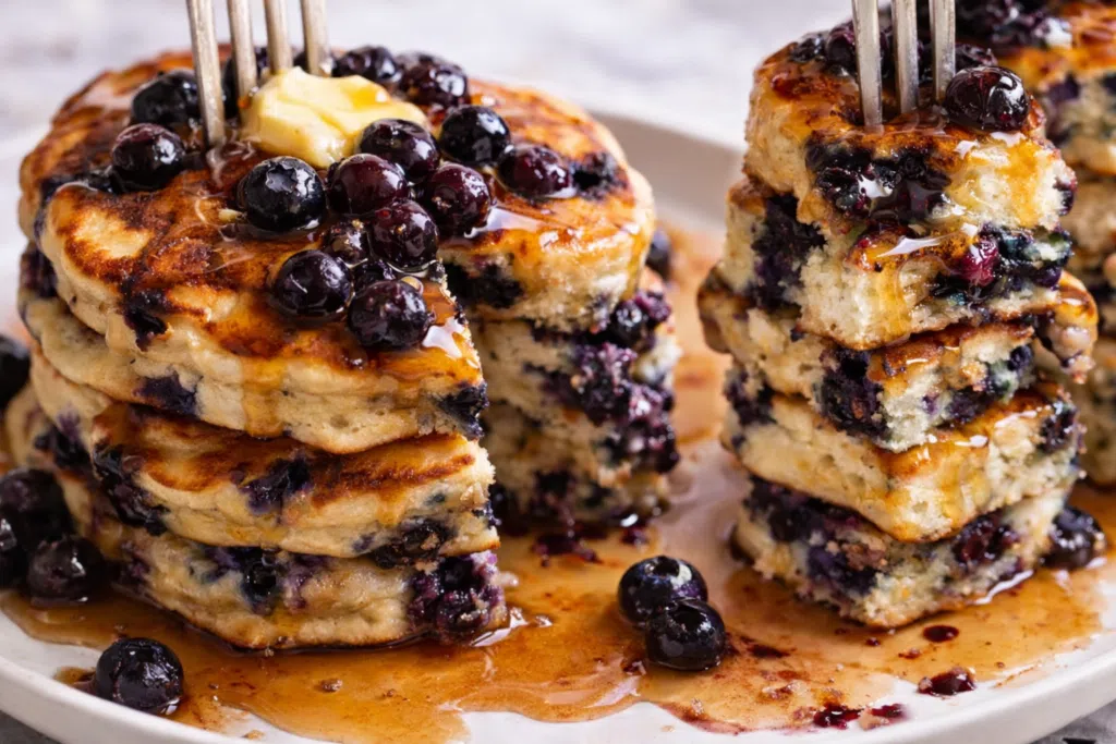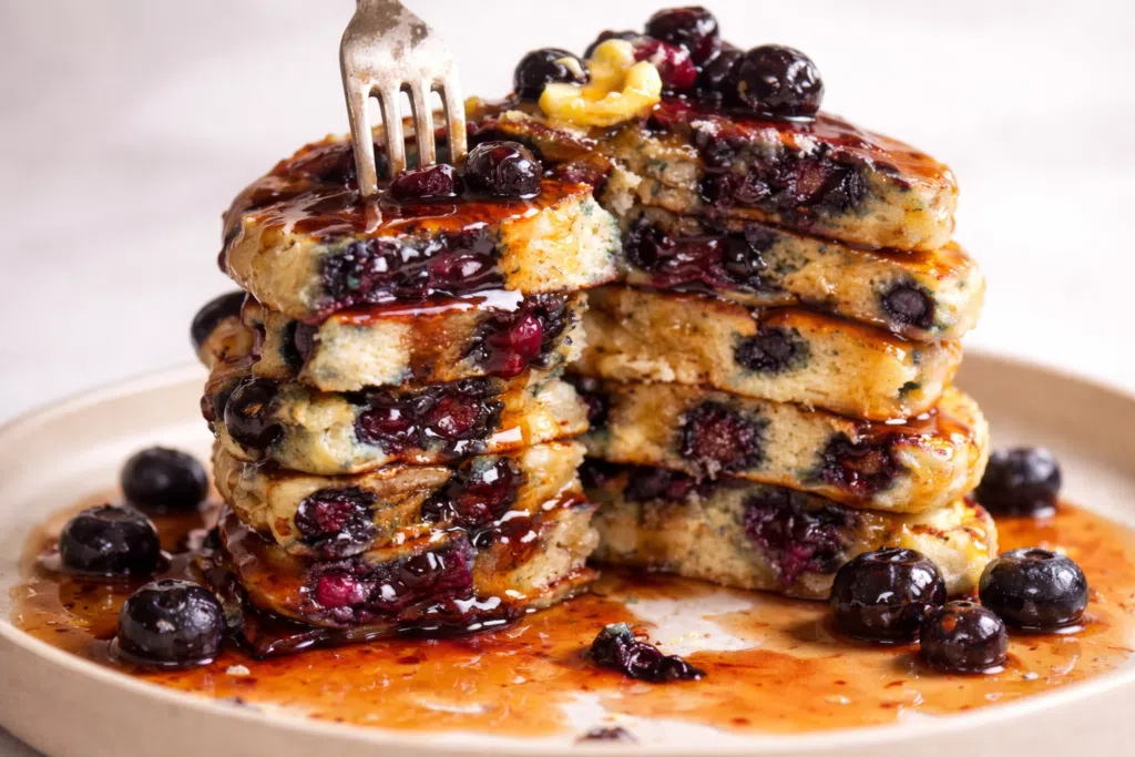 Soft, thick, and tender blueberry pancakes made with a simple batter and a secret ingredient for extra fluff. Perfect for slow weekend mornings or special family breakfasts.