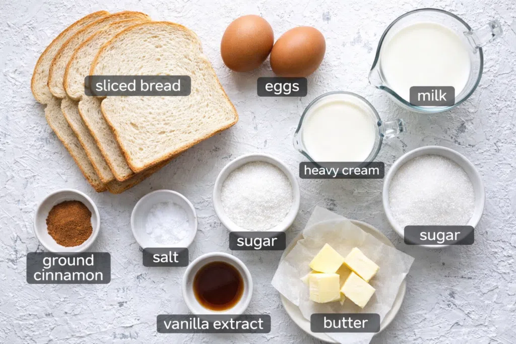 Bread: Slightly stale bread is ideal because it absorbs custard without falling apart. Soft fresh bread can become mushy. Thick slices give you that plush interior.
