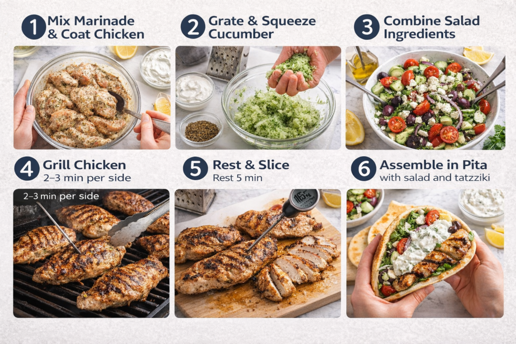 Proper preparation ensures thick, creamy tzatziki that clings to the chicken instead of dripping out of the wrap. Removing seeds and squeezing grated cucumber is not optional — it is essential for proper consistency and flavor balance.