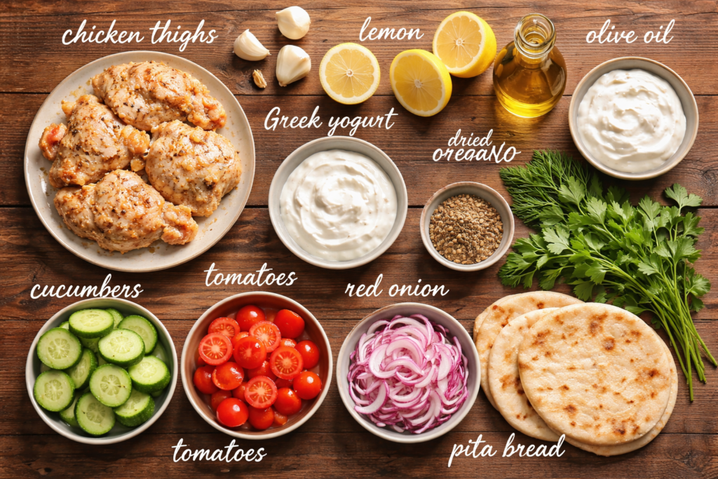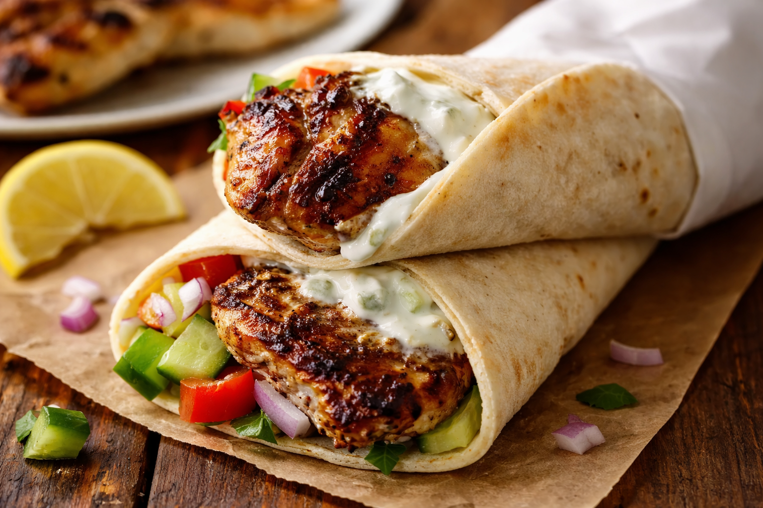 Juicy yogurt-marinated Greek chicken served in warm pita with creamy tzatziki and fresh tomato cucumber salad.