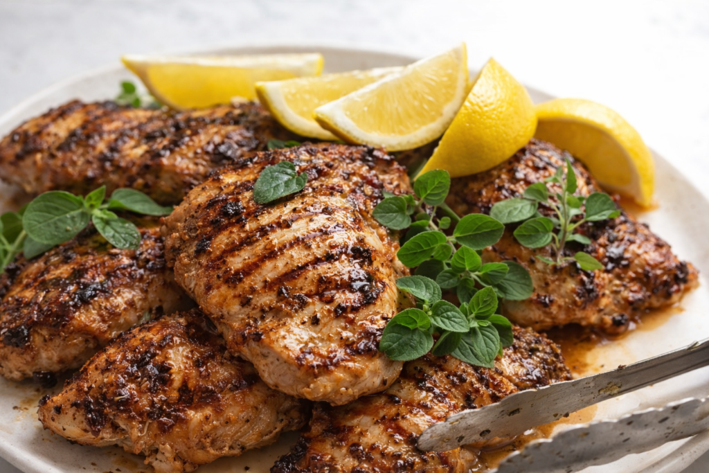 Lightly oil the surface. Remove excess marinade from chicken and cook 2–3 minutes per side until golden brown and internal temperature reaches 165°F (75°C).