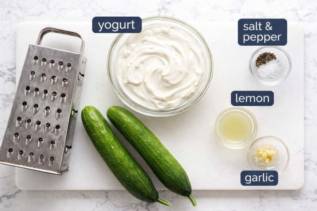 Grate and squeeze cucumber. Mix with tzatziki ingredients.