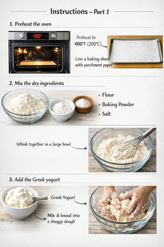 - Add the yogurt: Stir in the Greek yogurt until a shaggy dough forms. Then, use your hands to knead the dough lightly — it should come together but still feel slightly sticky.