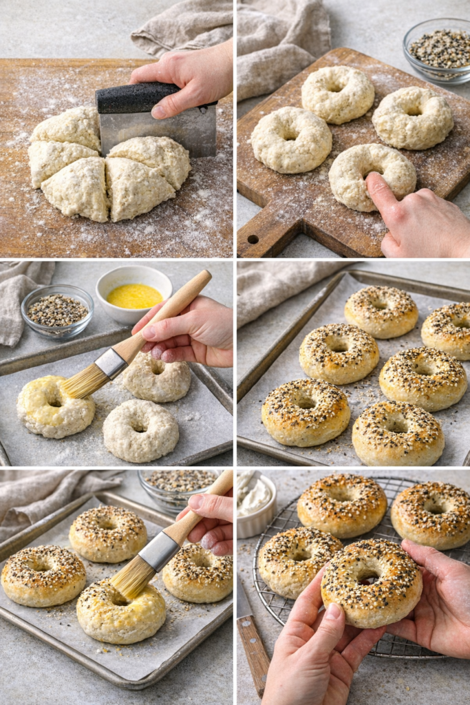 - Egg wash & toppings: Whisk the egg and brush over each bagel. Sprinkle on your favorite toppings — everything seasoning if you’re going classic.