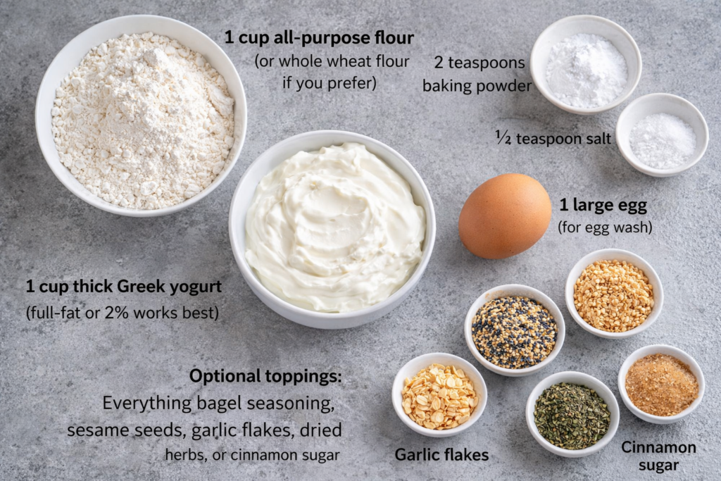 Here’s what you’ll need to make 4 soft-chewy Greek yogurt bagels: