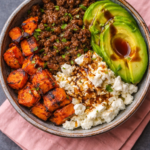 A bold and balanced one-bowl meal with roasted sweet potatoes, seasoned ground beef, creamy avocado and cottage cheese, finished with spicy-sweet hot honey.