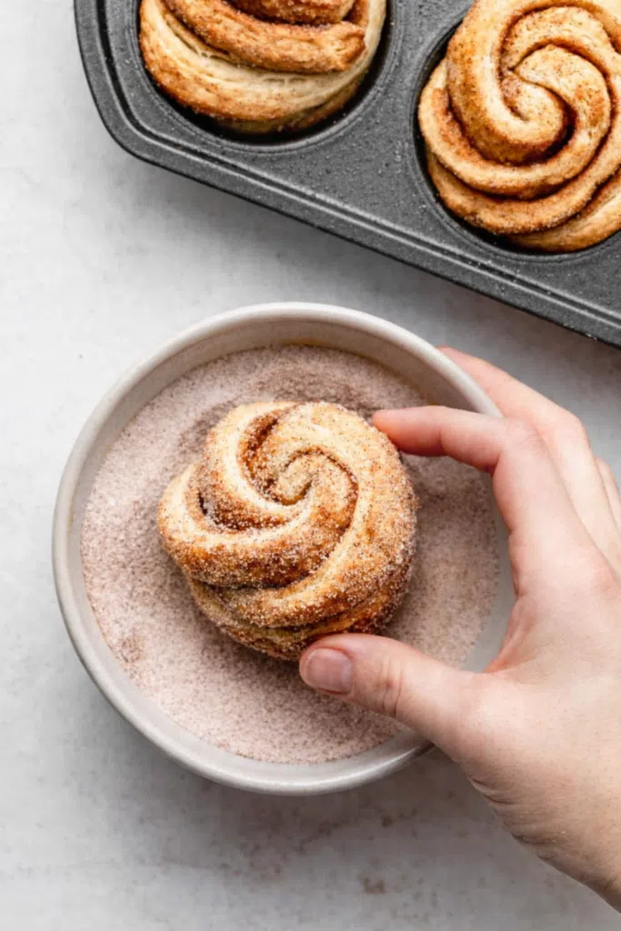 Once cool enough to handle, roll each cruffin in the remaining cinnamon sugar.