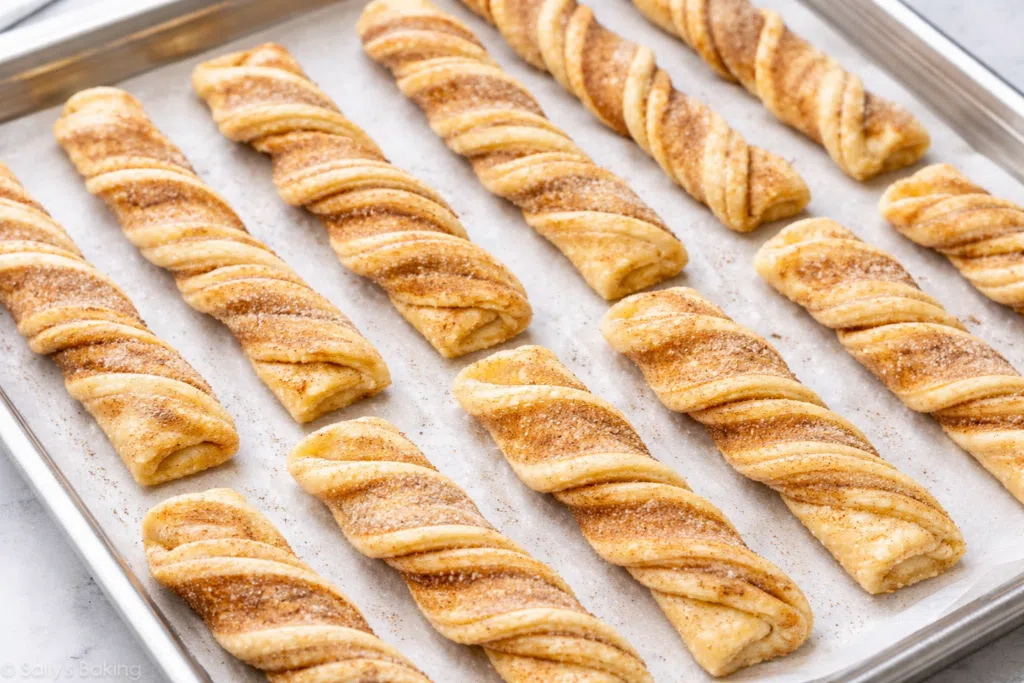Once laminated, divide the dough into portions. Roll each into a rectangle, sprinkle generously with cinnamon sugar, and cut into strips.