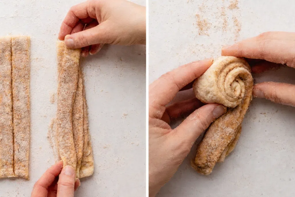 Sprinkle evenly with 2 tablespoons cinnamon sugar, pressing it gently into the dough. Cut into 12 one-inch strips. Stack 3 strips together, roll them into a tight spiral, tuck the ends underneath, and place into a muffin cup.