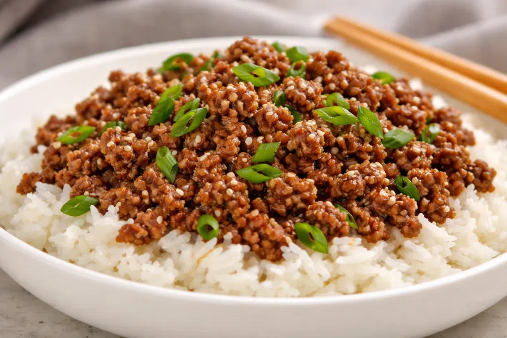 A quick and flavorful Korean-inspired ground beef bowl made with soy sauce, brown sugar, garlic, and sesame oil served over fluffy rice.