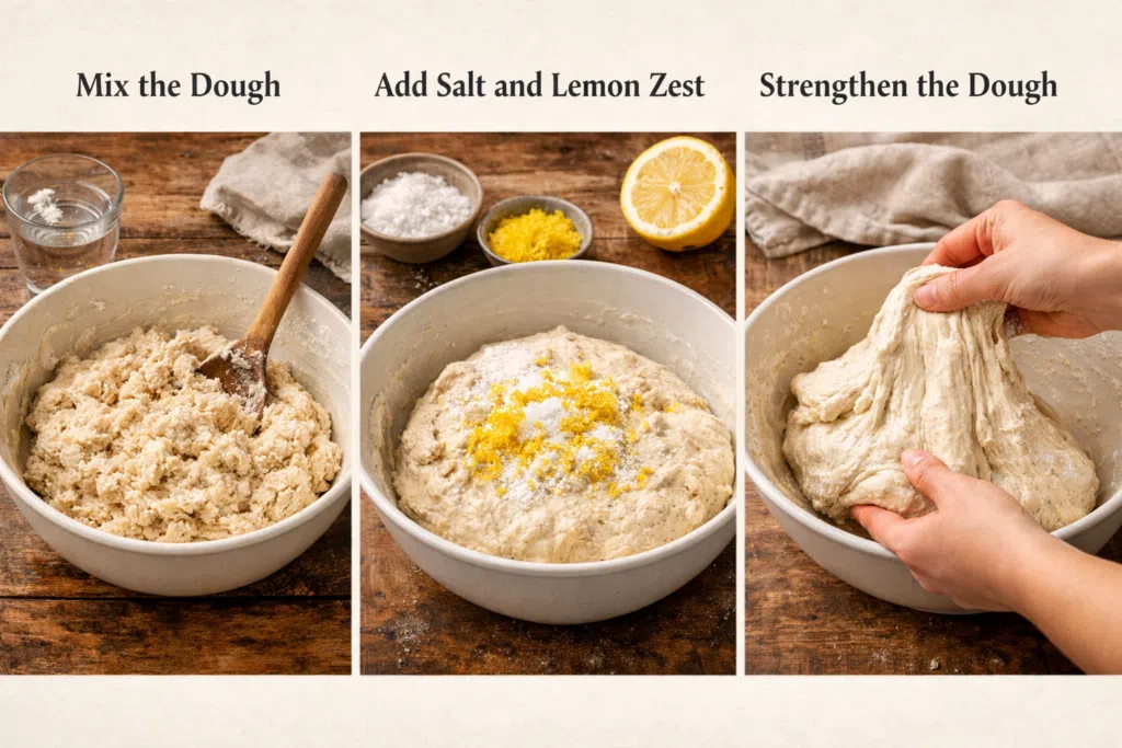 Sprinkle the salt evenly over the dough, followed by the lemon zest. Gently pinch and fold the dough to distribute both. You’ll start to feel the dough tighten slightly — a sign that structure is developing.
