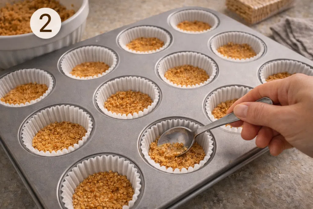 - Press about one tablespoon of the mixture firmly into each liner. Use the back of a spoon to compact it. The crust should be tight and even — this prevents crumbling later.