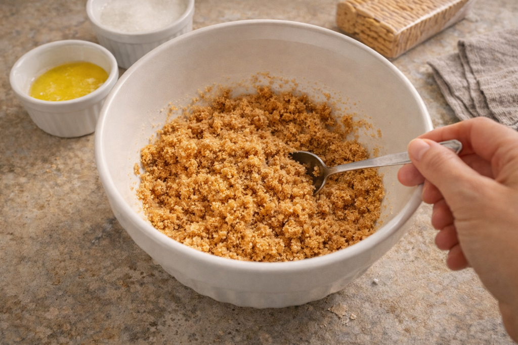 - In a bowl, combine graham cracker crumbs, sugar, and melted butter. Stir until the texture resembles wet sand. If it feels too dry, add a teaspoon more melted butter.