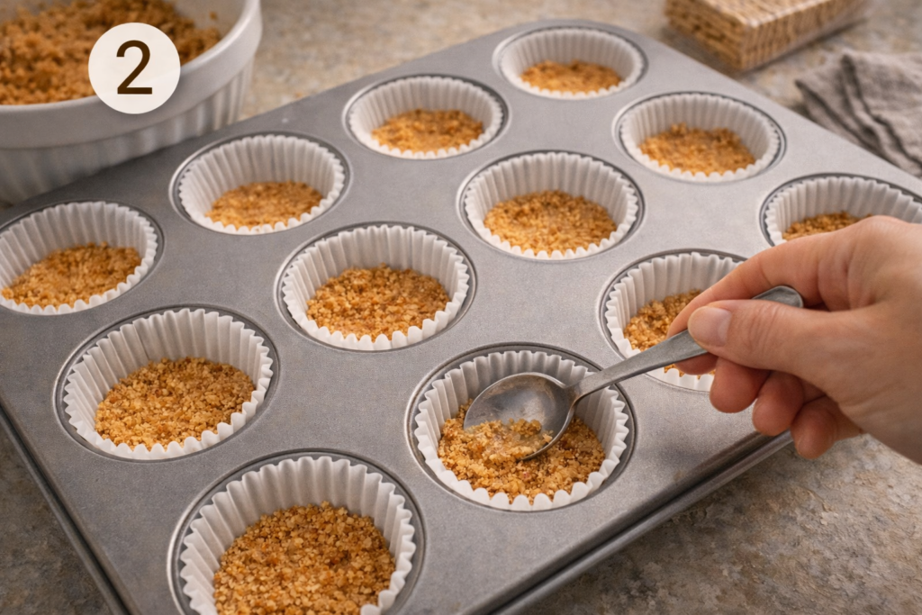 - Press about one tablespoon of the mixture firmly into each liner. Use the back of a spoon to compact it. The crust should be tight and even — this prevents crumbling later.