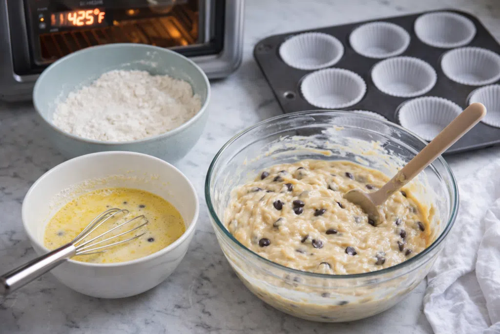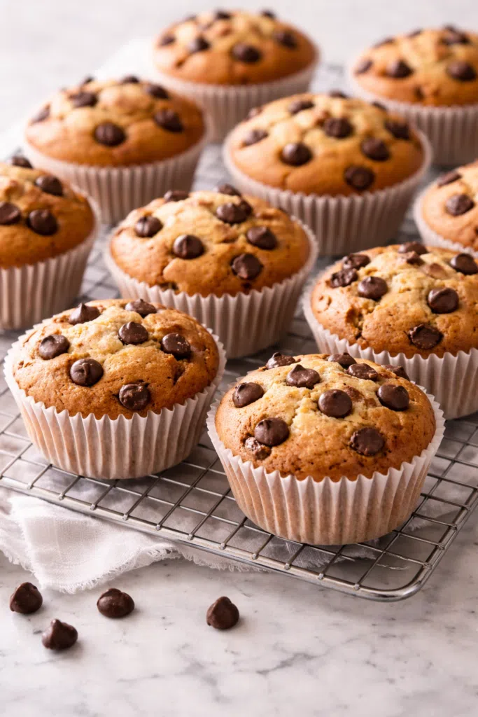 The correct approach is to keep the batter thick and avoid excess liquid. Reserve some chips for topping so every muffin looks generous and balanced.