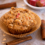 This rhubarb muffins recipe is such a delightful way to use fresh or frozen rhubarb. Every bite combines tart fruit, hearty oats, and a soft, fluffy texture topped with a golden cinnamon streusel.