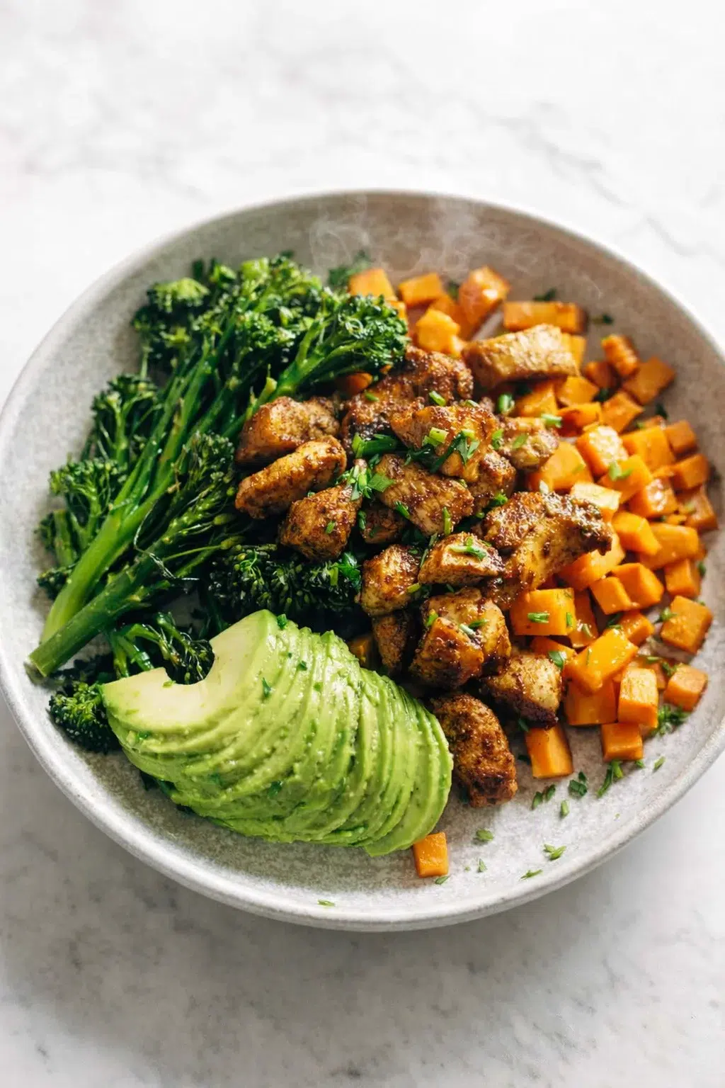 These sheet-pan chicken and sweet potato bowls are the ultimate busy weeknight lifesaver—quick, forgiving, and totally reliable—and if you prefer the stovetop, try a one-pan chicken and sweet potato skillet. About 45 minutes of roasting is all it takes to have a bunch of ready-to-eat meals lined up for your week. Every bowl offers a great balance of protein, fiber, and vibrant color thanks to the combo of spiced chicken, sweet potatoes, and green veggies, and you can easily remix the leftovers with different sauces and toppings—think BBQ chicken and roasted sweet potato bowls—to keep your taste buds happy.
