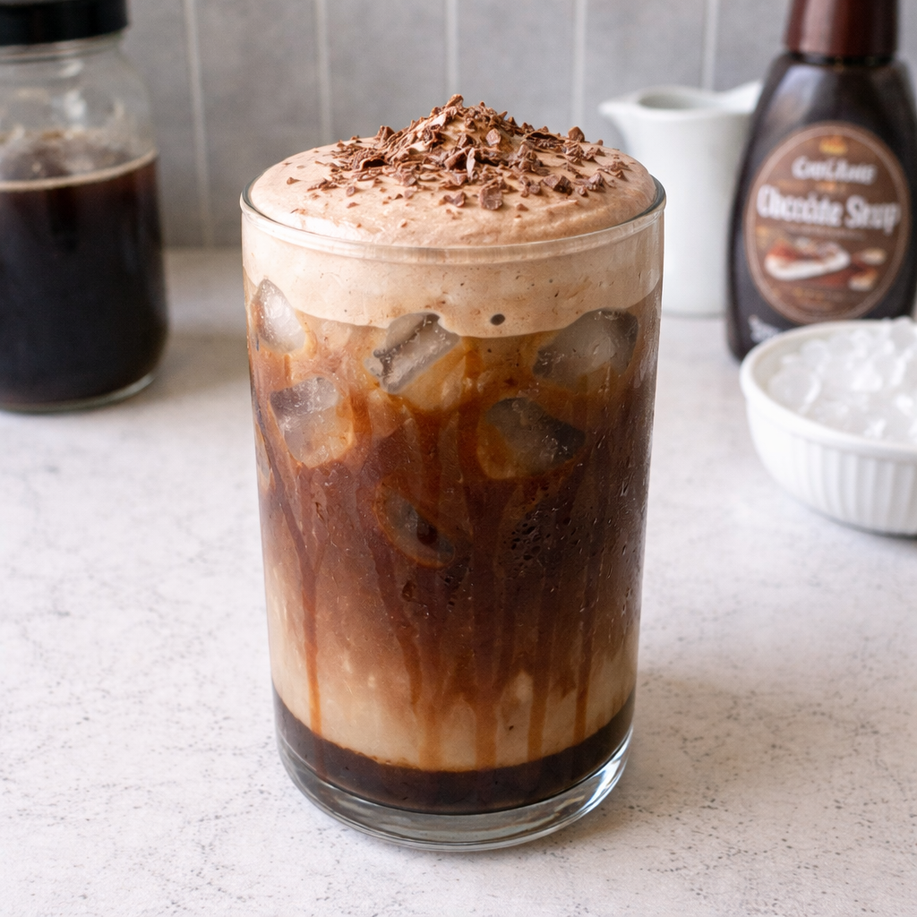 Pour cold brew over ice. Shake cream and chocolate syrup until thickened and pour over the top.