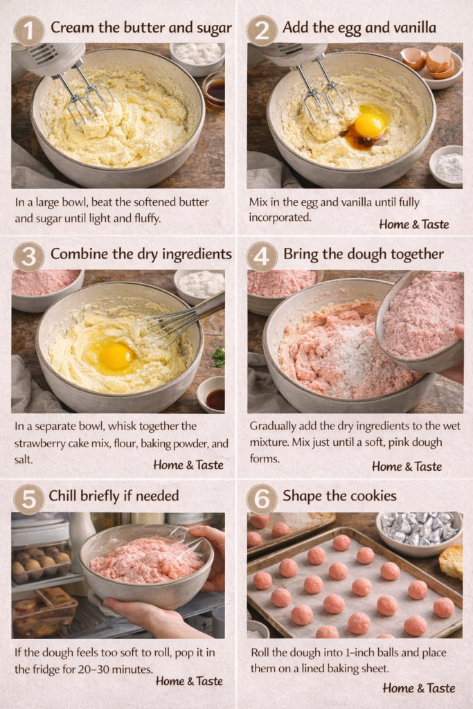 In a separate bowl, whisk together the strawberry cake mix, flour, baking powder, and salt. This keeps the leavening evenly distributed and avoids dense pockets in the cookies. - Bring the dough together