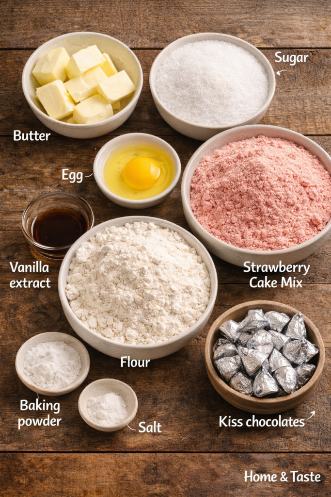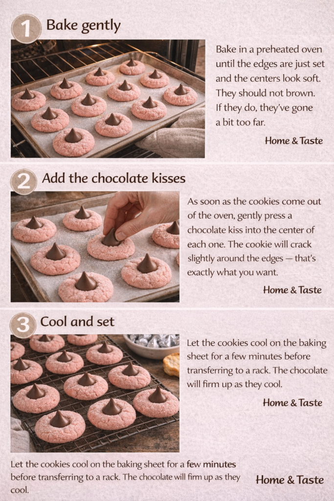 Soft, pink strawberry-flavored cookies topped with a classic chocolate kiss — easy, festive, and perfect for sharing.