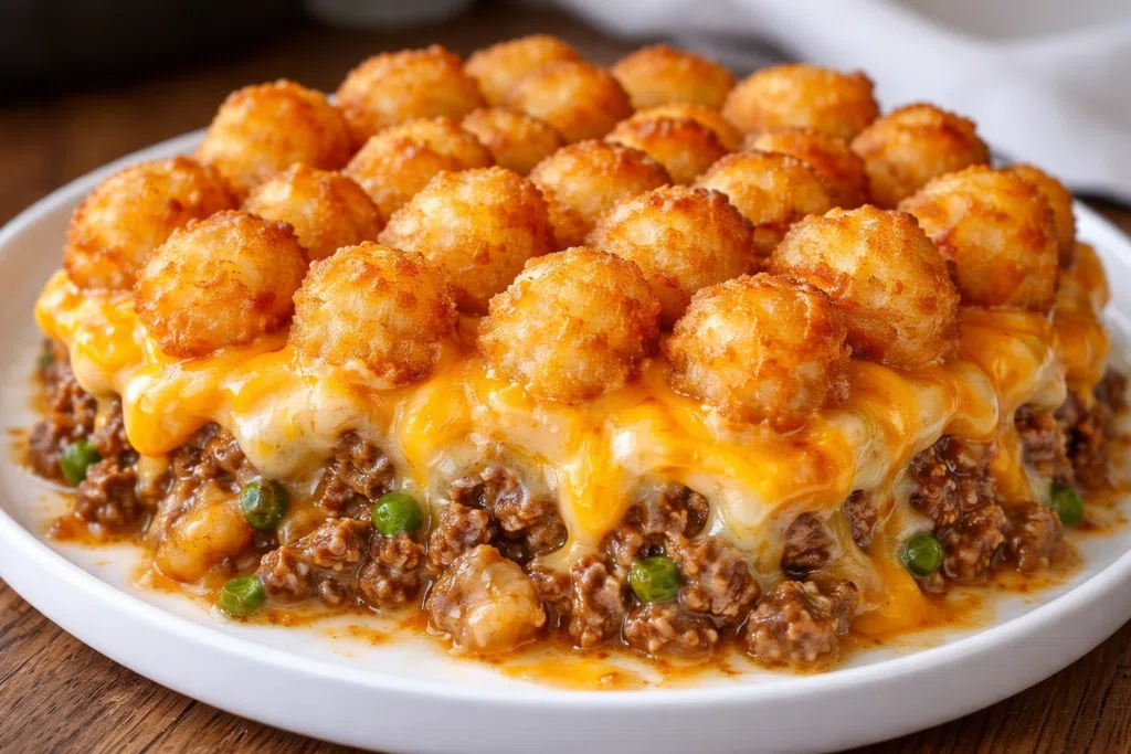 A hearty, family-friendly casserole made with seasoned ground beef, creamy sauce, melted cheese, and crispy tater tots on top.