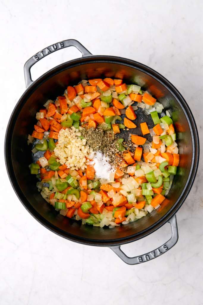 Heat olive oil in a large pot over medium heat. Add the chopped onion, carrots, and celery. Stir gently and let them cook for about 6–8 minutes, until the onions turn translucent and everything smells slightly sweet.
