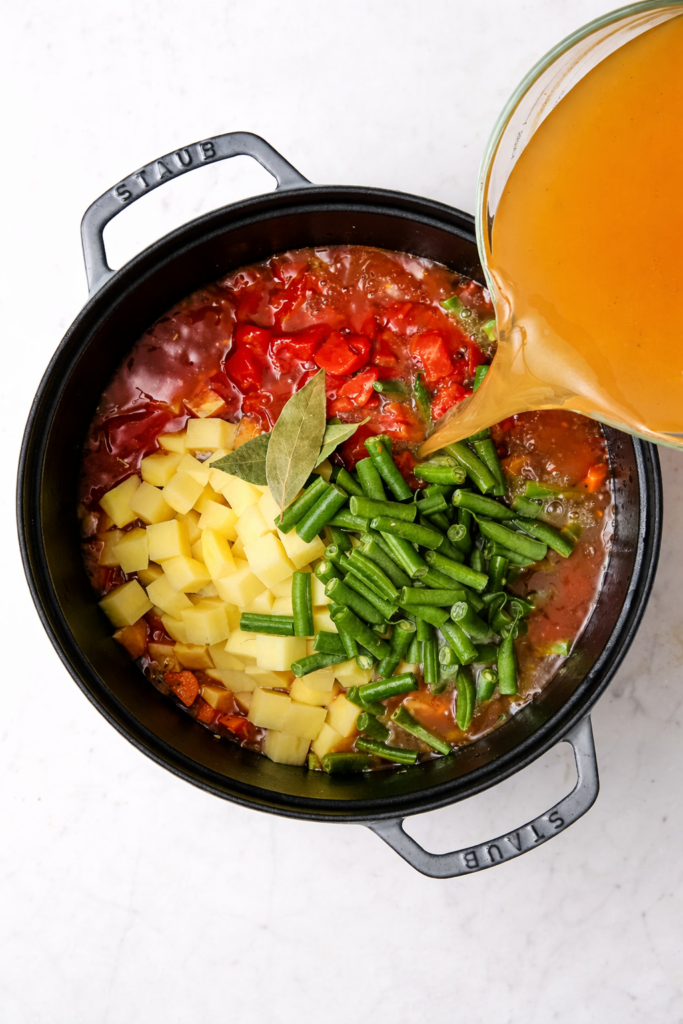 Pour in the diced tomatoes with their juices and the vegetable broth. Add bay leaf, thyme, salt, and pepper. Stir gently.